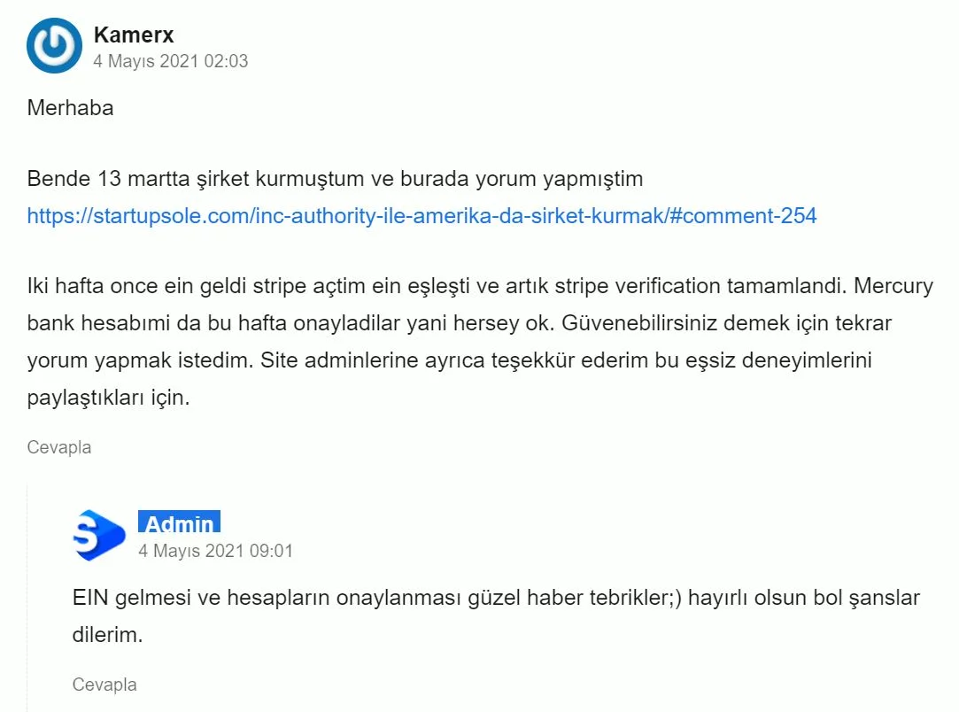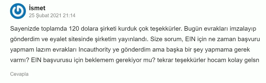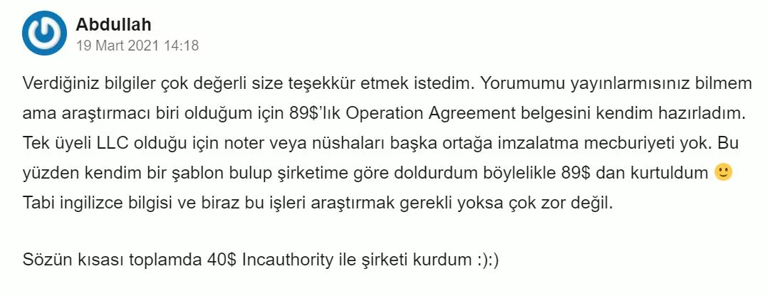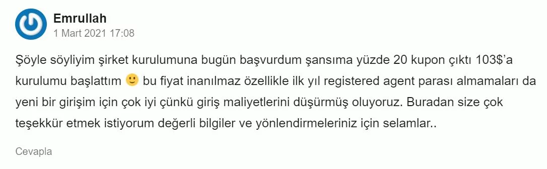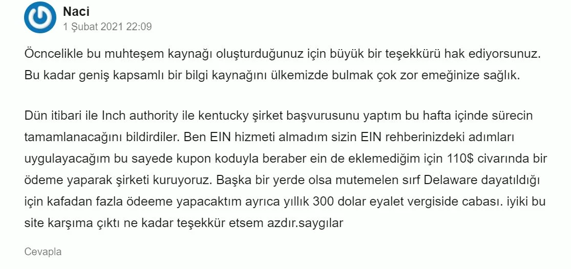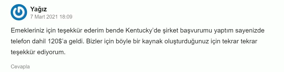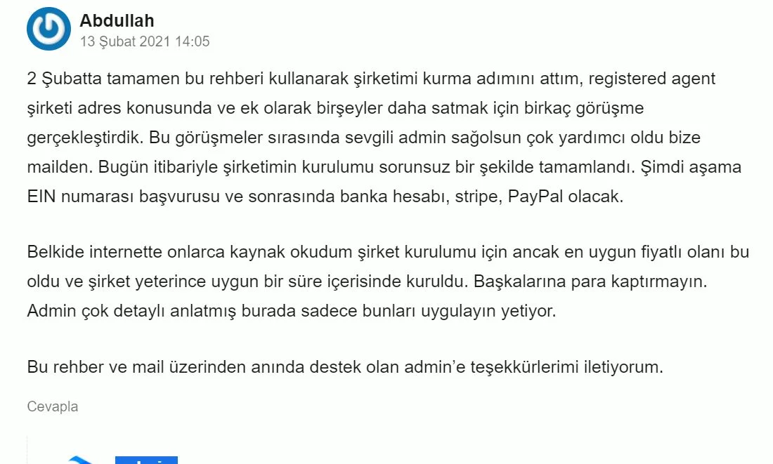 2021 yılından bu yana blogumuzdaki yöntemleri uygulayarak bir çok kişi Amerika'da şirketini kurdu. Şirketini kuran girişimciler mail yoluyla veya yaptıkları yorumlarla bunu desteklediler.