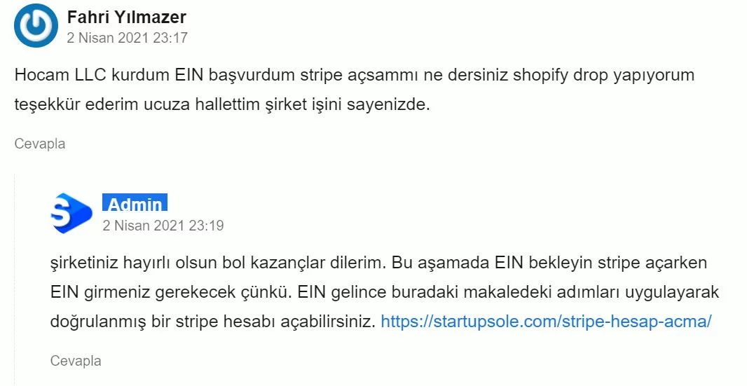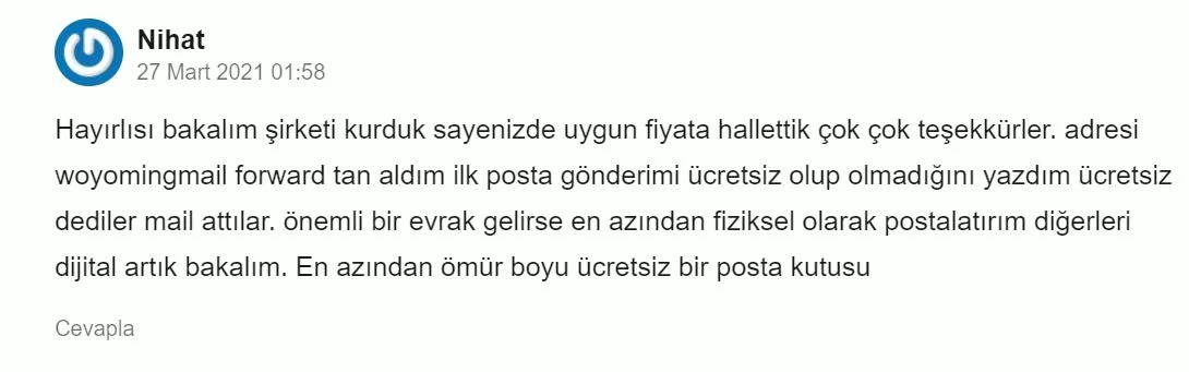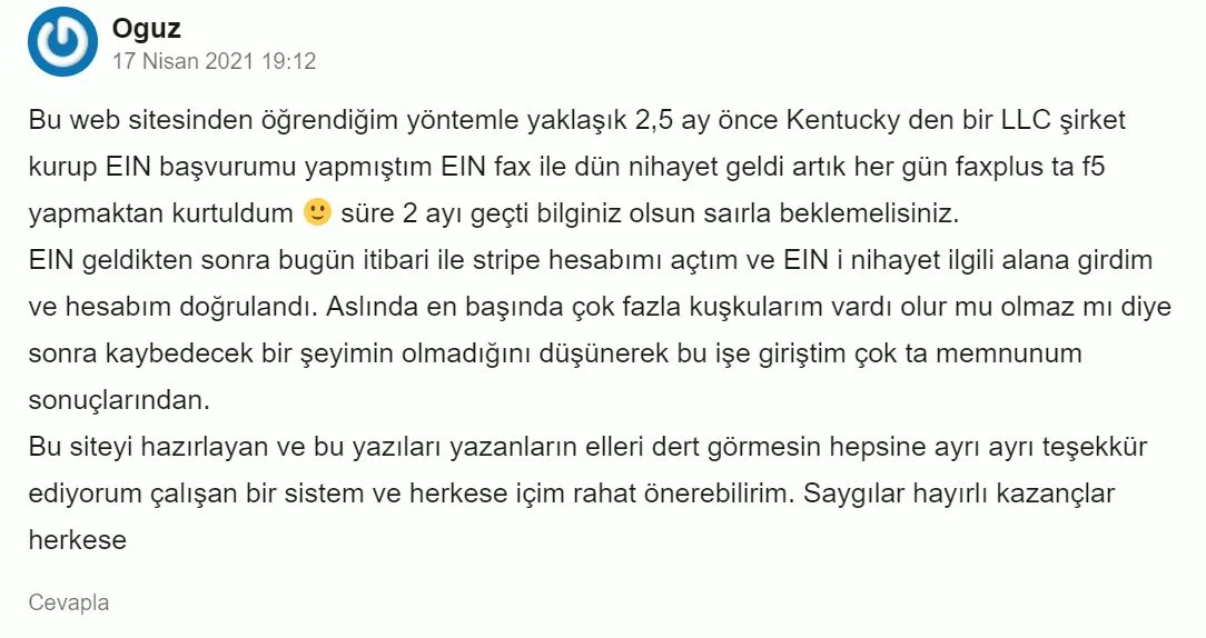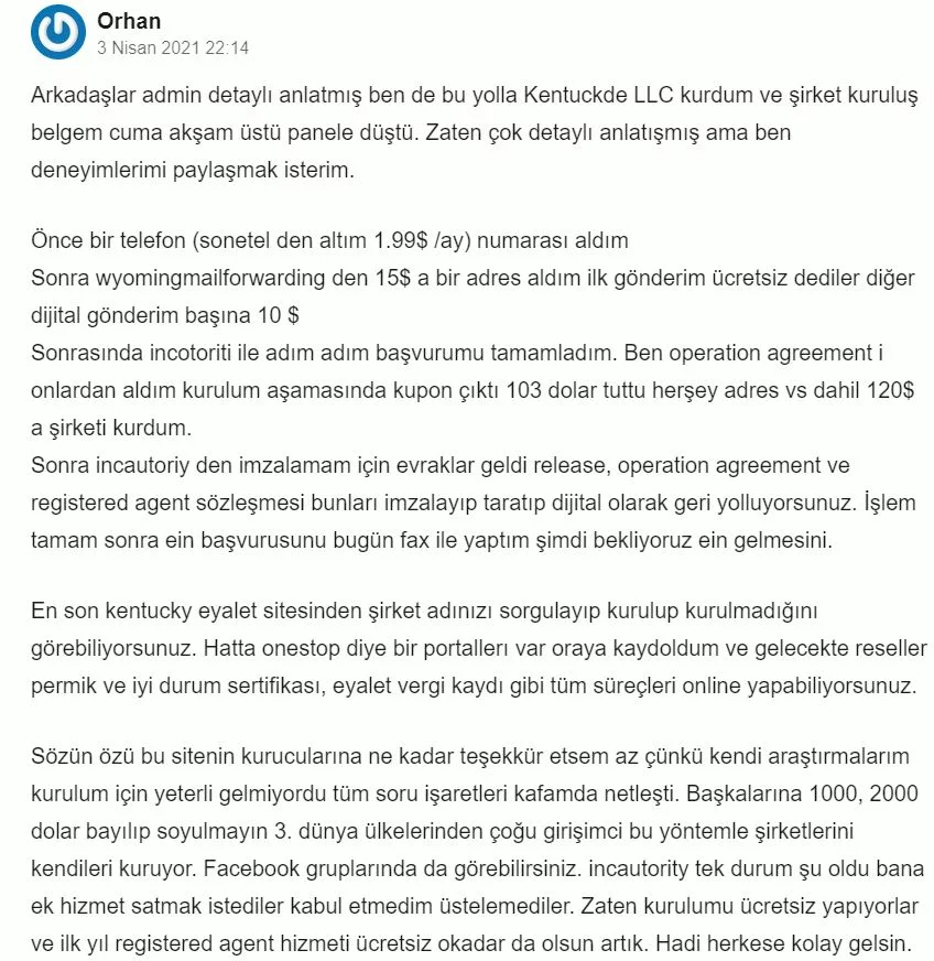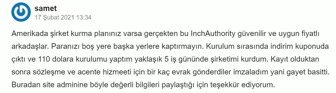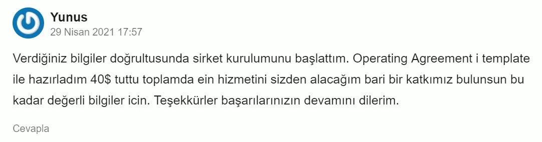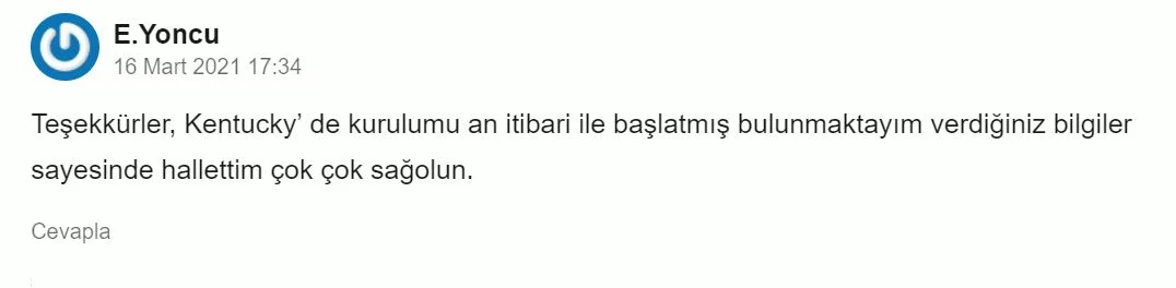 2021 yılından bu yana blogumuzdaki yöntemleri uygulayarak bir çok kişi Amerika'da şirketini kurdu. Şirketini kuran girişimciler mail yoluyla veya yaptıkları yorumlarla bunu desteklediler.