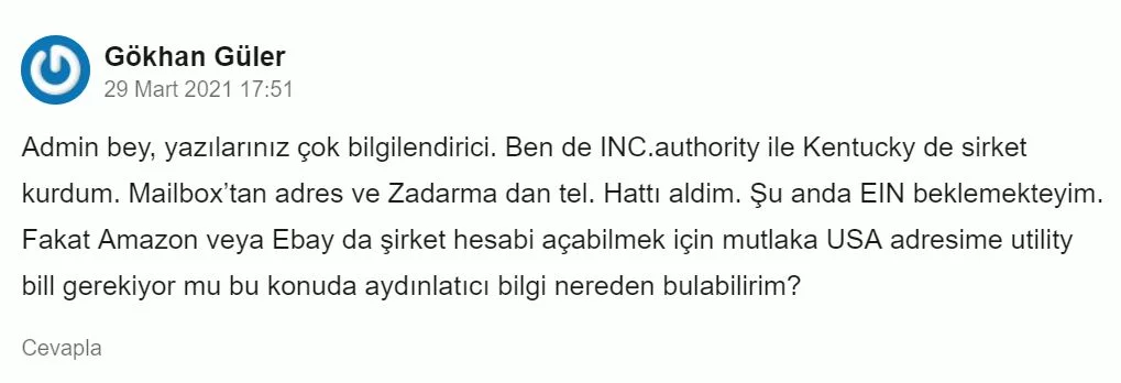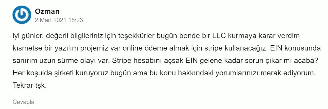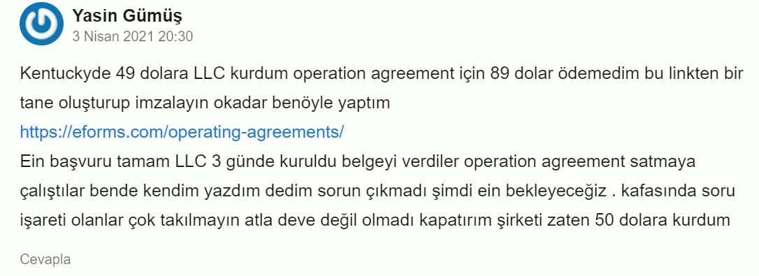Amerika'da şirket kurma ile ilgili an itibari ile yaklaşık 170 tartışma (yorum) bulunan makaledeki diğer kullanıcı deneyimlerine aşağıdaki konudan göz atabilirsiniz.