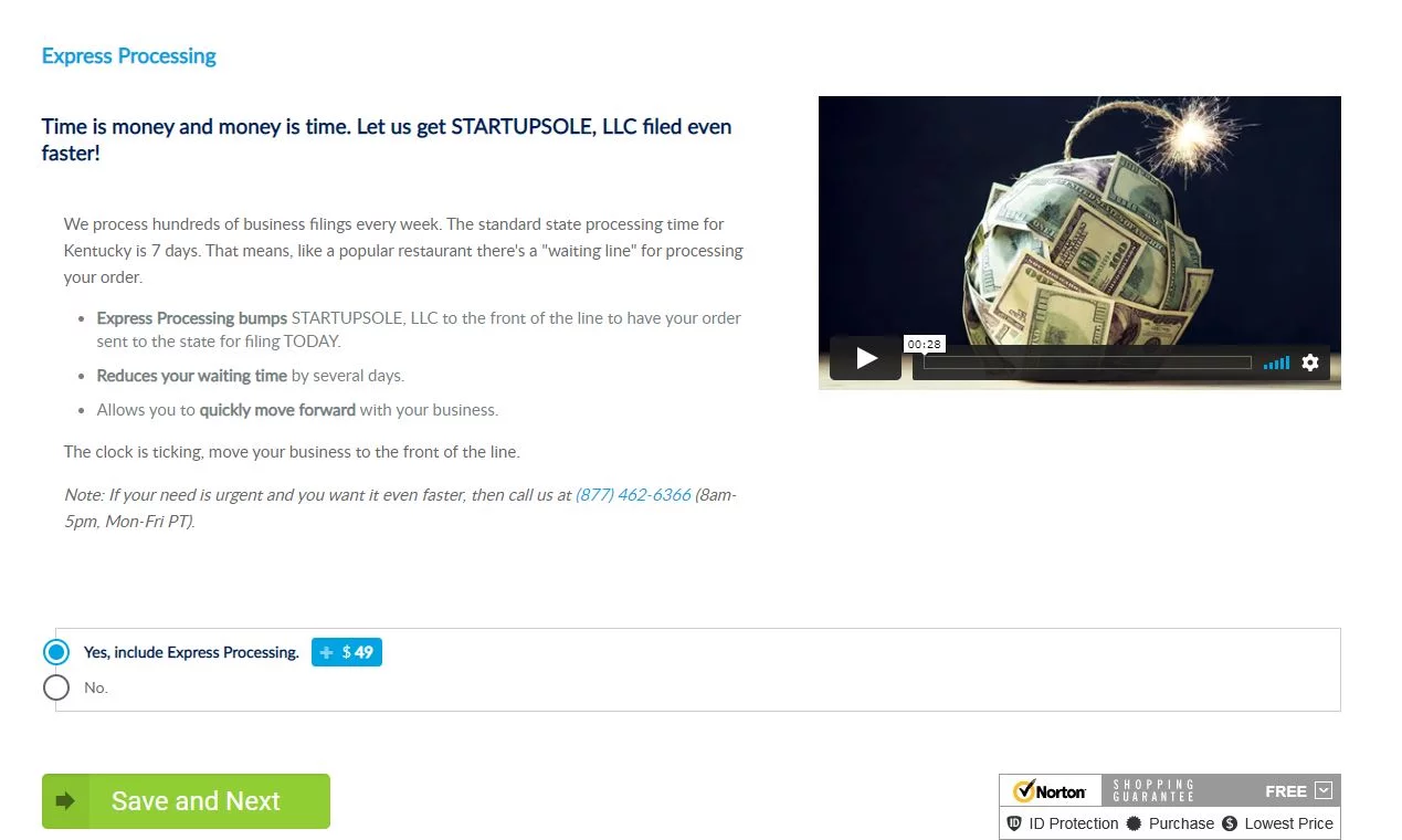 Bu aşağıdaki adımda standart 7 gün sürecek şirket kurma süresini hızlandırmak için ekstra ücret ödeyebilirsiniz. Süreyi biraz daha kısaltmak için seçim size kalıyor. No seçip ilerliyoruz.